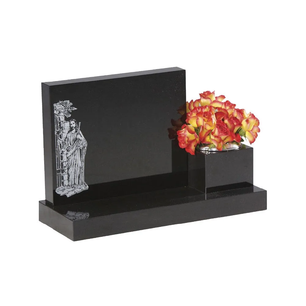 This memorial is a wonderful way to honour the life of a departed loved one. Formed from robust granite, this memorial is designed to stand the test of time. This simple design features a sleek polished finish with an intricately etched ‘Peter of the Gate’ design, or a design of your choice. Complete with a side memorial flower vase.