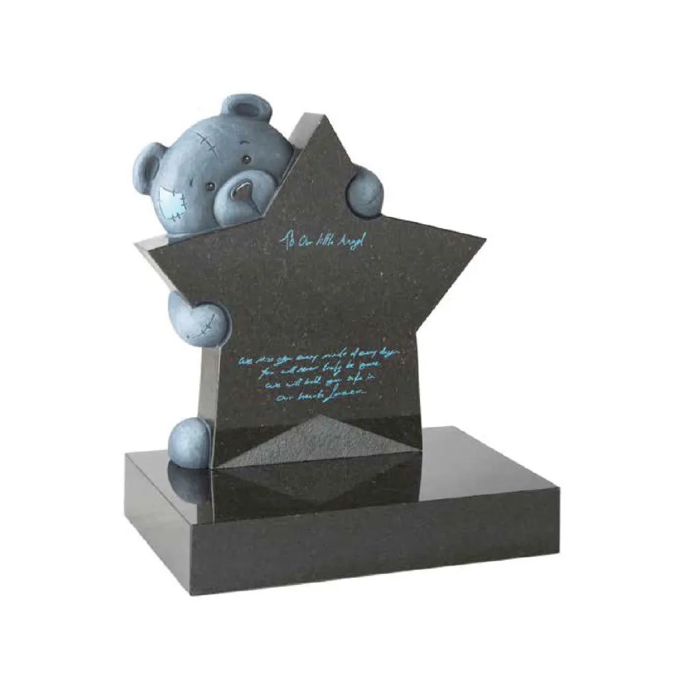A beautiful Dark Grey Granite fully carved ‘patch’ teddy and star memorial. The inscription can be created from a handwritten dedication as shown. This technique can be used to personalise many of the memorials in our Children’s Memorials section.