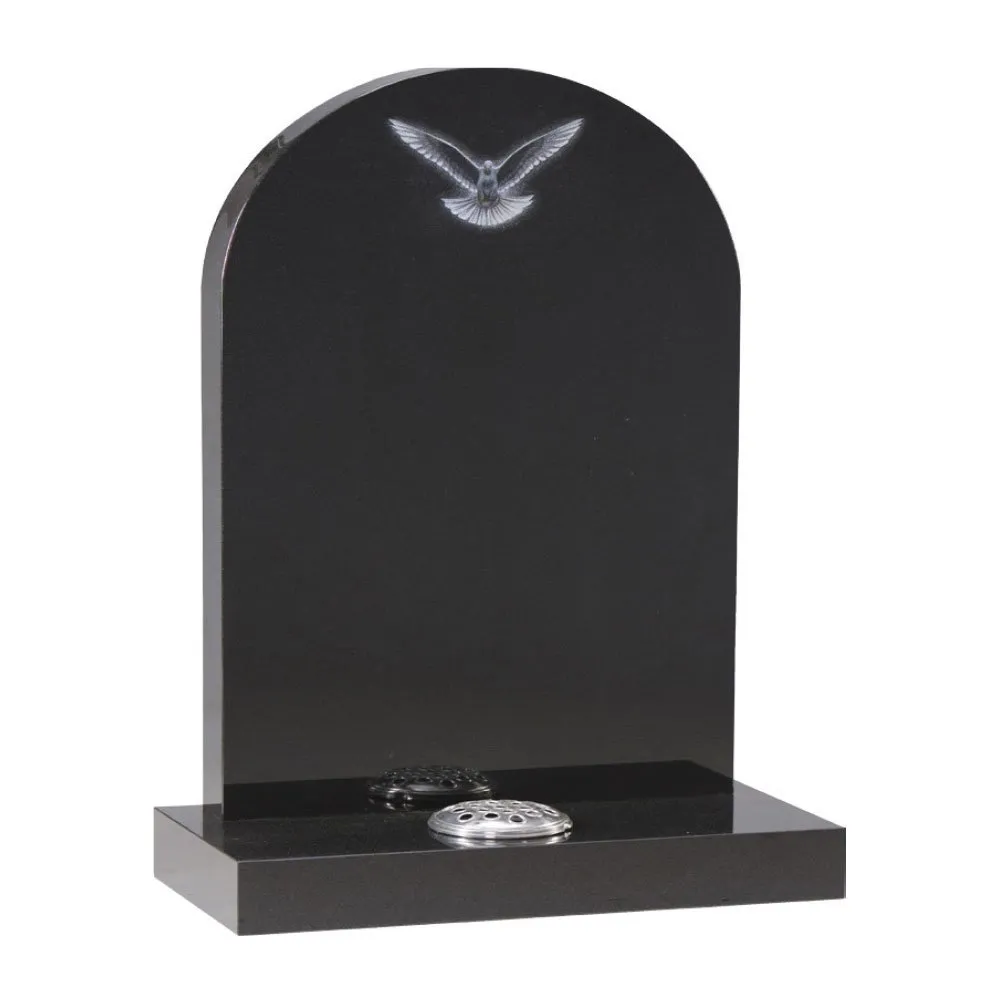A striking tribute to your departed loved one; this headstone features an elegantly curved top and strong rectangular base. Expertly crafted using quality granite, this headstone is designed to withstand harsh outdoor conditions. It has a beautifully etched dove on the top and a flower vase in the base.